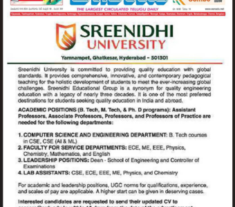 Current Openings - 2025 SREENIDHI UNIVERSITY Yamnampet, Ghatkesar, Hyderabad 501301 Sreenidhi University (SNU) is committed…
